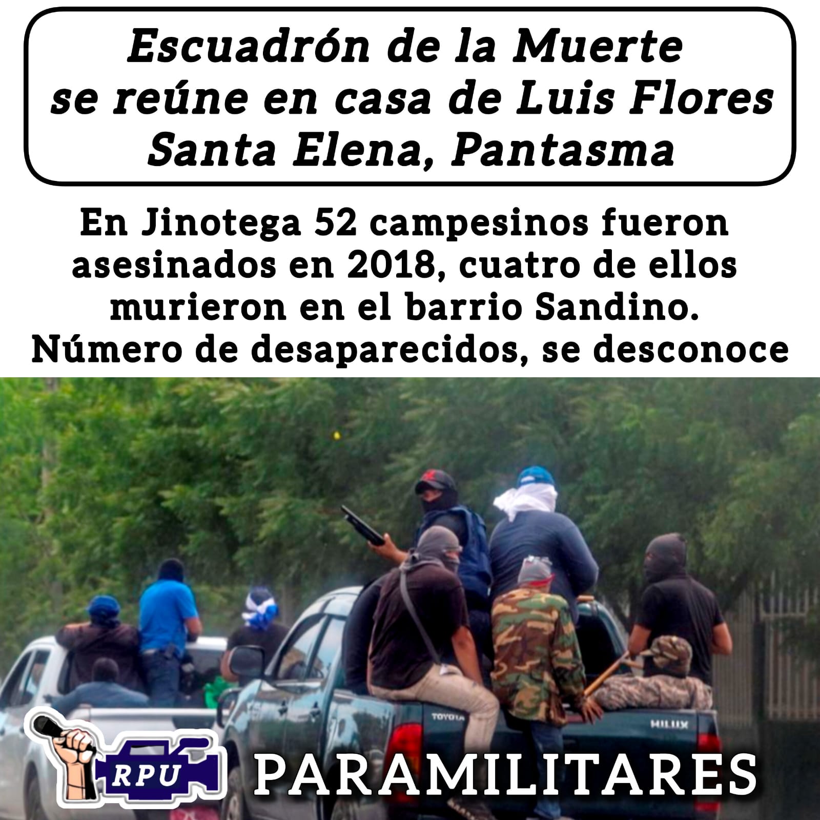 La Unidad Democrática Nicaragüense – Fuerzas Unidas de Defensa del Pueblo a través de su medio de comunicación oficial Radio Pueblo Unido, estará compartiendo con su auditorio una lista de nombres y fotografías de algunos de los paramilitares del departamento de Jinotega. Las víctimas de estos crímenes reclaman justicia, y castigó para los responsables materiales e intelectuales al servicio de la dictadura militar sandinista.