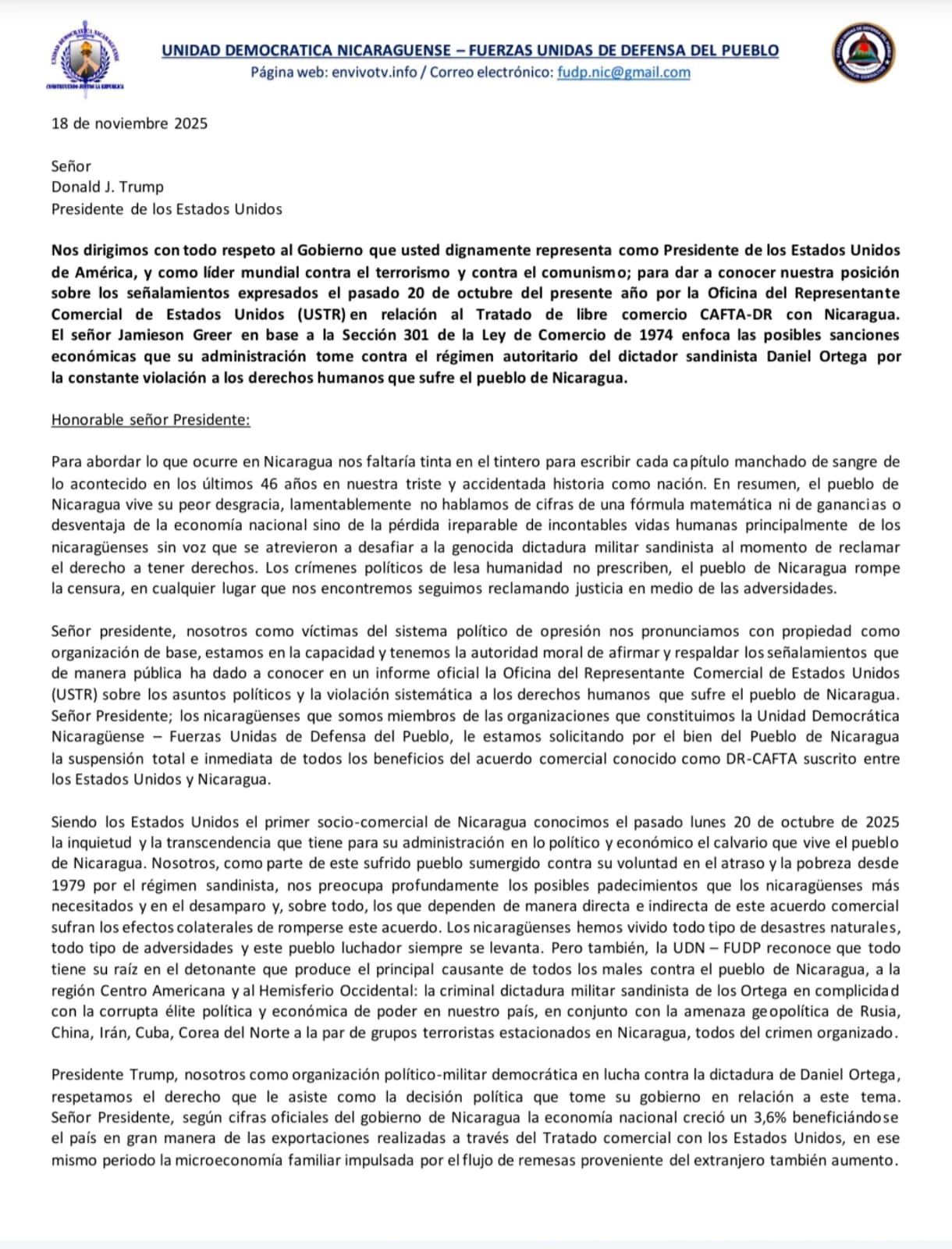 Señor Presidente Donald J. Trump; los nicaragüenses que somos miembros de las organizaciones que constituimos
